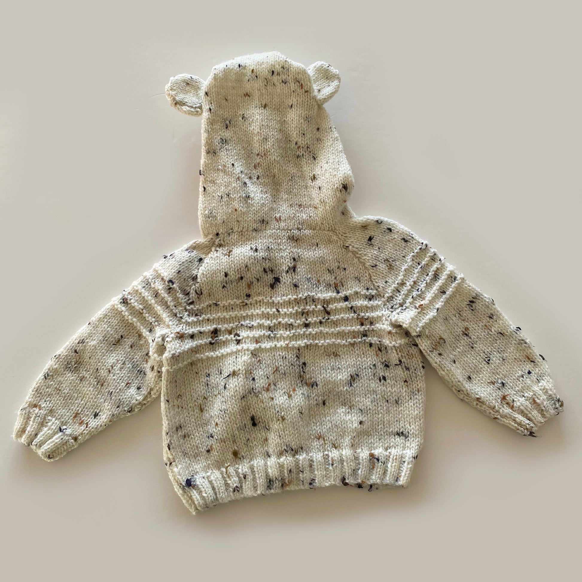 6-12M mottled cream hand-knitted cardigan with bear hood - new